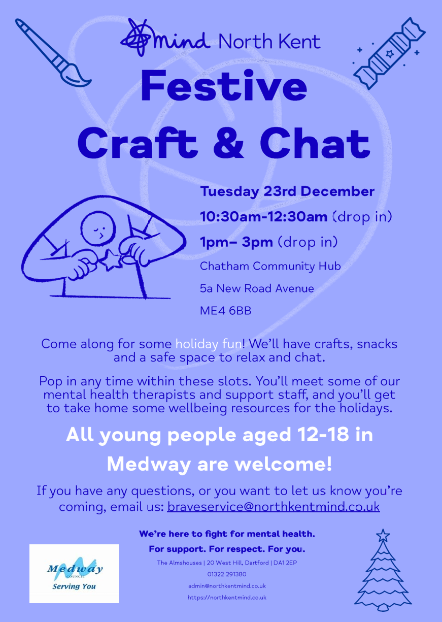 Over the Christmas period, Wellbeing Services will be running two Christmas drop in’s, within Dartford and Medway, available for anyone 17+ within the local area. Any attendee’s will need to sign up on the day, however we will be hosting Christmas games, promoting social inclusion, have a light lunch and refreshments available and everyone will receive a wellbeing Christmas box from North Kent Mind.