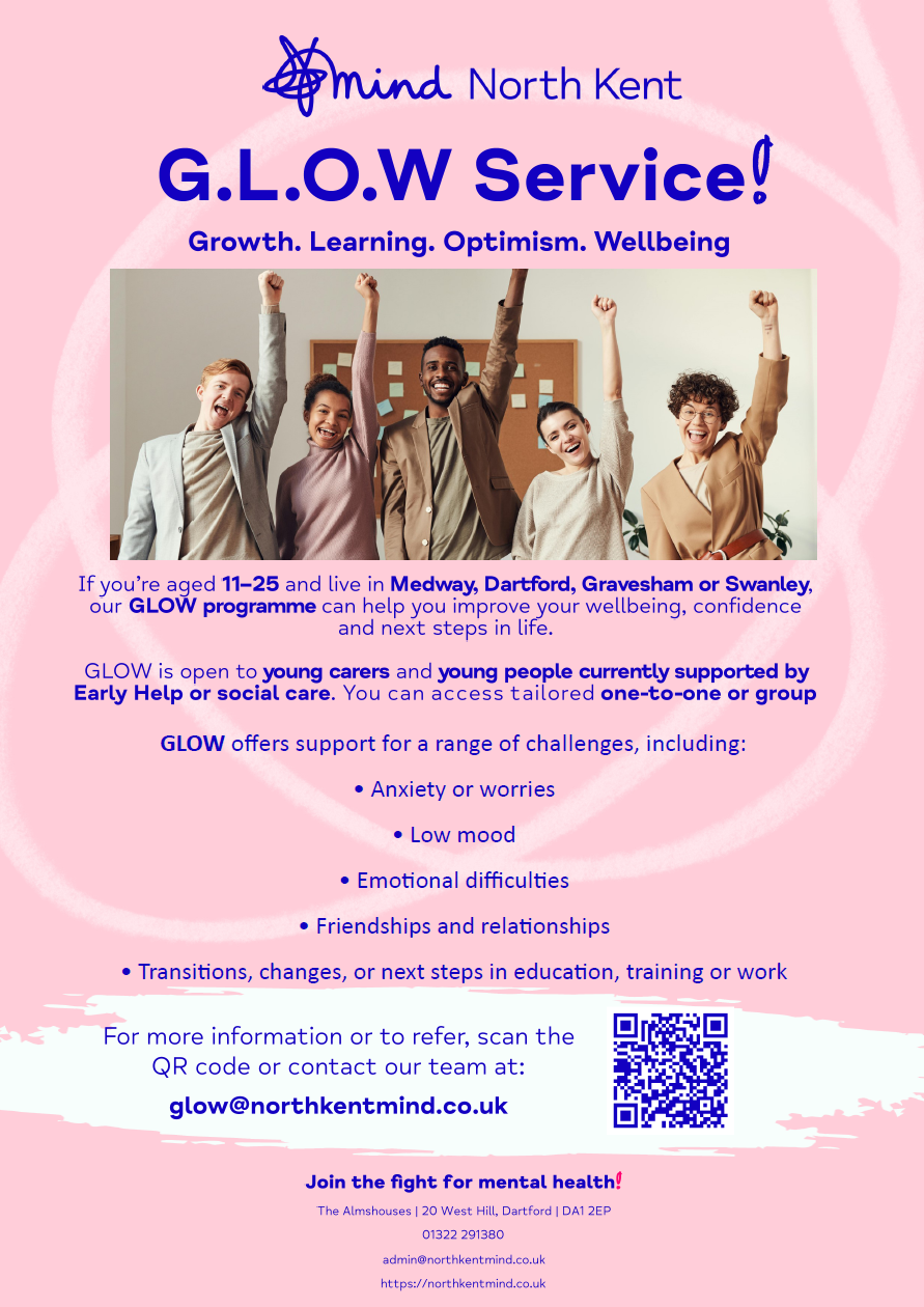 If you’re aged 11–25 and live in Medway, Dartford, Gravesham, or Swanley, our GLOW programme can help you feel more confident, connected and ready for what’s next.